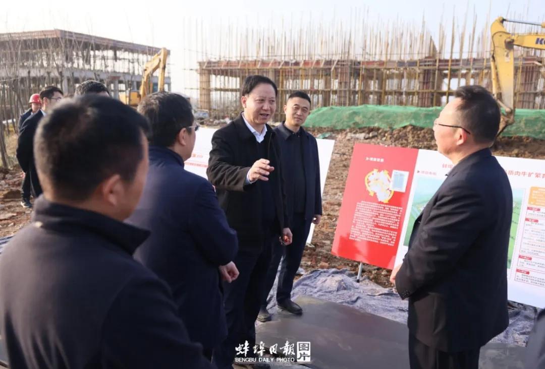 黃曉武書記現場察看施工進度,詳細了解項目進度、規劃設計等情況,陳建功董事長對項目建設和后期運營有關問題進行詳細介紹。黃書記對該項目建設表示充分肯定,強調要進一步加快建設進度,優化運營模式,積極探索聯農帶農新模式,發展“智慧+生態”一體化肉牛養殖體系,要把鄉村產業發展擺在更加突出位置,下更大功夫抓好“糧頭食尾”“畜頭肉尾”“農頭工尾”增值大文章,充分發揮蚌埠優勢,深入實施“秸稈變肉”暨肉牛振興計劃,加強高品質肉牛繁、育、加全產業鏈建設,加快肉牛產業轉型升級,為鄉村振興提供有力產業支撐。