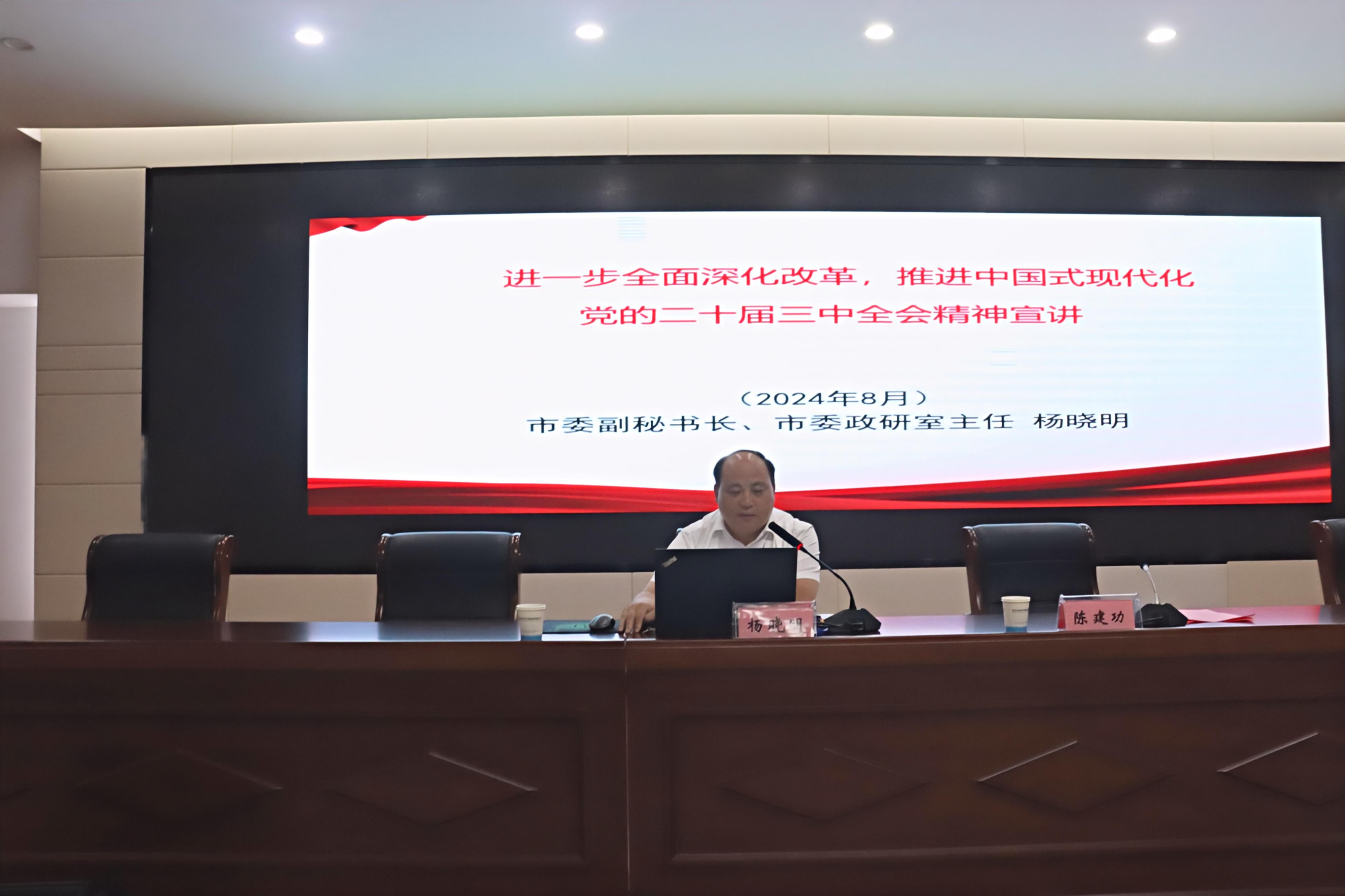 楊曉明以《進一步全面深化改革推進中國式現(xiàn)代化》為主題,緊緊圍繞習近平總書記在黨的二十屆三中全會上的重要講話和全會《決定》,從深刻認識進一步全面深化改革的重大意義、全面把握黨的二十屆三中全會的改革重點、以釘釘子精神抓好改革落實和從《決定》看國資國企高質量發(fā)展方向四個方面,對全會精神進行了系統(tǒng)闡述和全面講解,并結合蚌埠市工作實際,進一步解讀了全面深化改革的主旨要義。