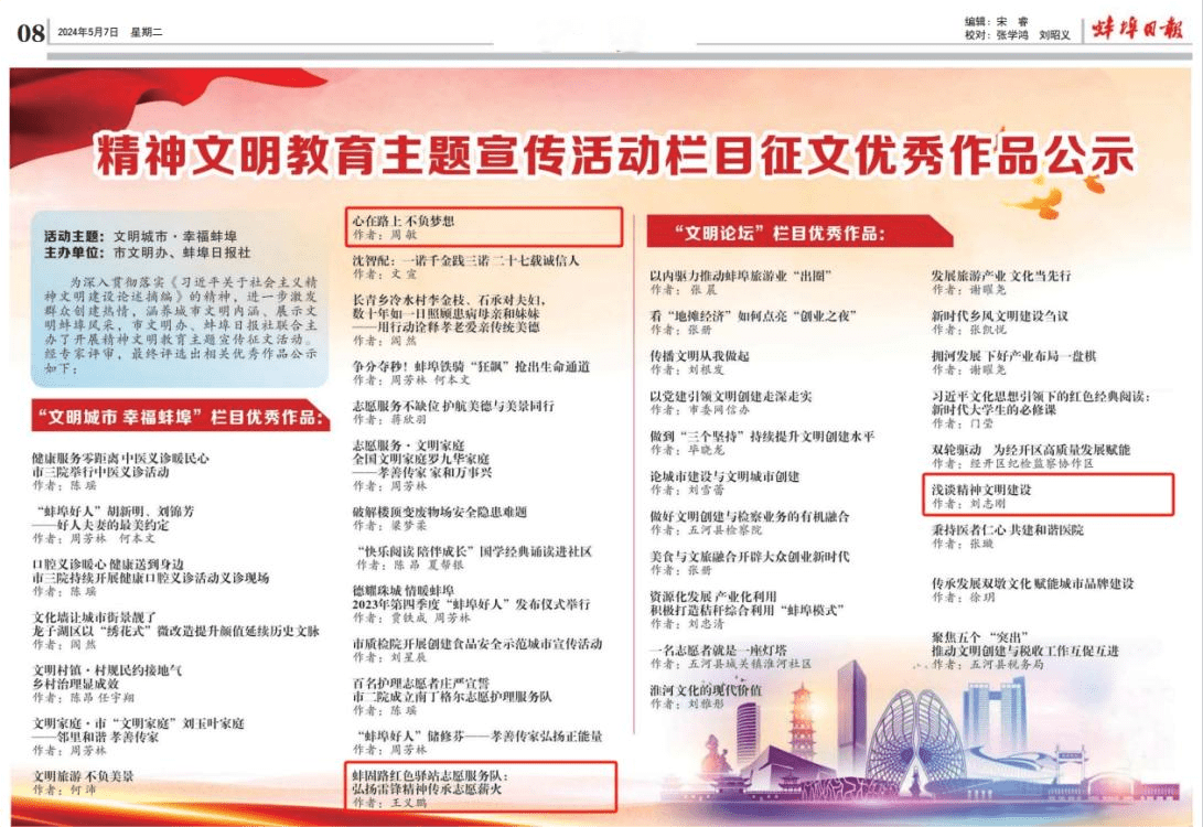 5月7日,由市文明辦、蚌埠日報社聯合主辦的精神文明教育主題宣傳征文活動結果揭曉,蚌固路公司職工劉志剛的征文作品《淺談精神文明建設》、王義鵬的征文作品《蚌固路紅色驛站志愿服務隊:弘揚雷鋒精神傳承志愿薪火》和路橋公司職工周敏的征文作品《心在路上 不負夢想》獲評優秀作品。