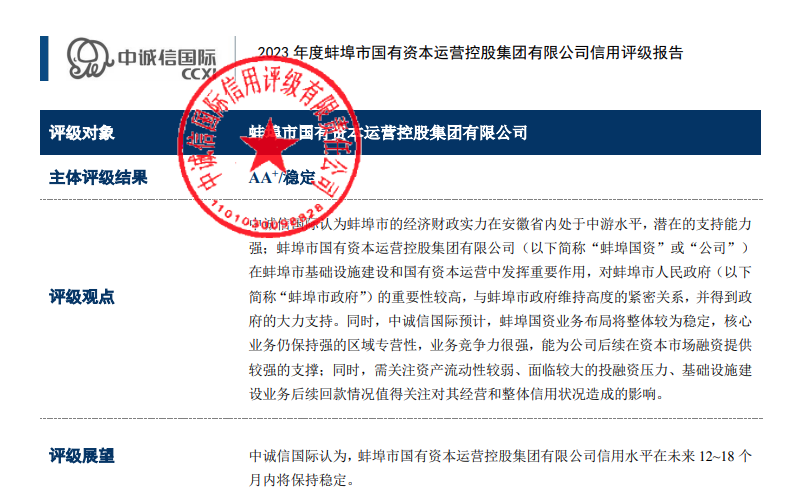 2023年94日,經中誠信國際信用評級有限公司評定,蚌埠市國有資本運營控股集團有限公司再次成功獲評AA+主體信用評級,評級展望為穩定,時效期為一年。這是蚌埠國控集團繼202285日獲得東方金誠國際信用評估有限公司評定的AA+主體信用評級后,再次評為AA+級信用主體,實現了AA+主體信用“雙評級”。