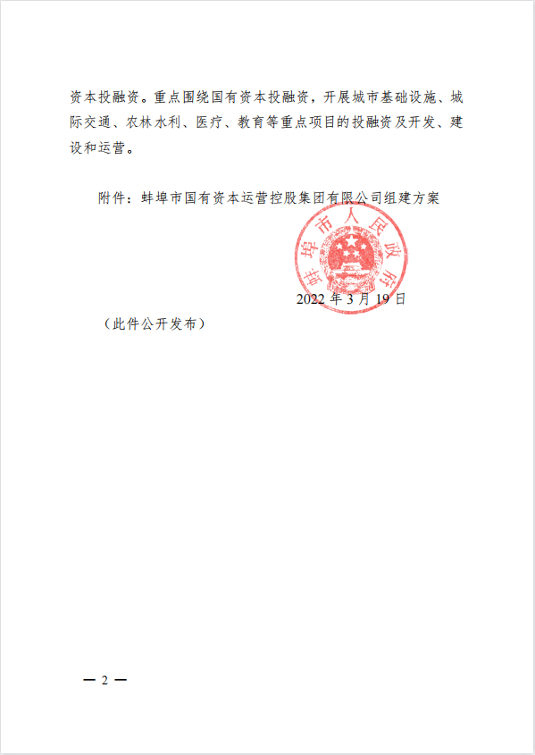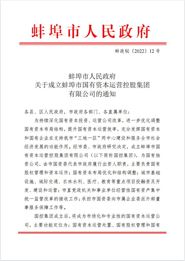 蚌埠市人民政府關于成立蚌埠市國有資本運營控股集團有限公司的通知