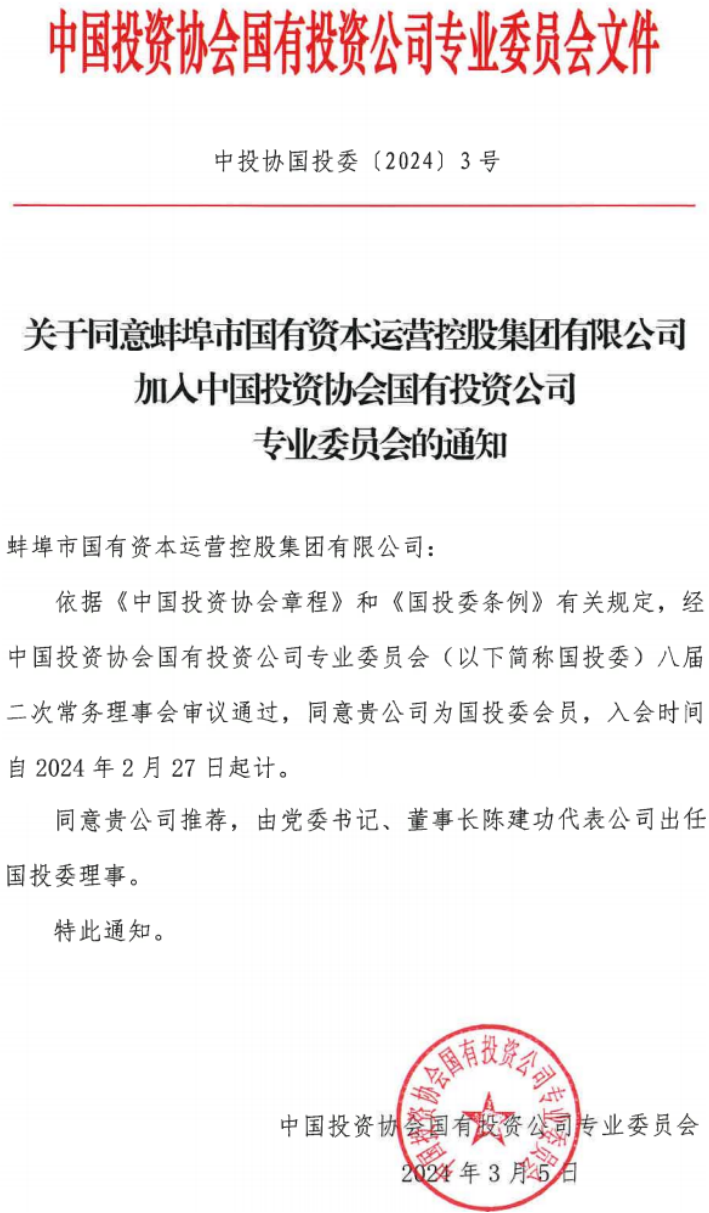熱烈祝賀蚌埠國控集團(tuán)加入中國投資協(xié)會國有投資公司專業(yè)委員會